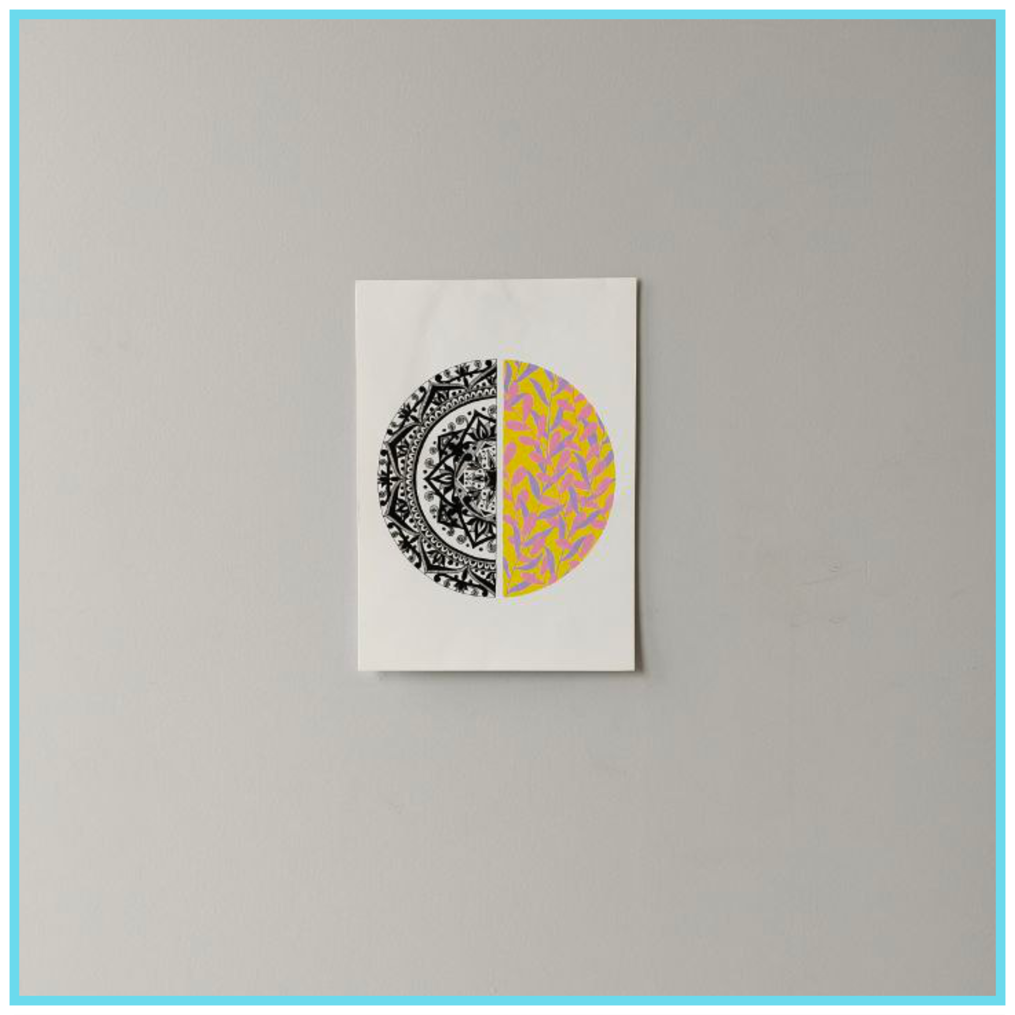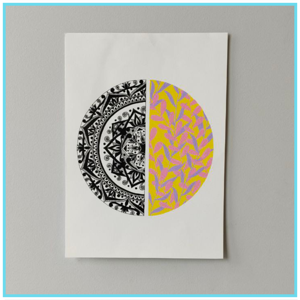 Half a black and white mandala. Half colourful floral pattern. It is a joyful yet calming drawing. Perfect to light up any room! 🙂