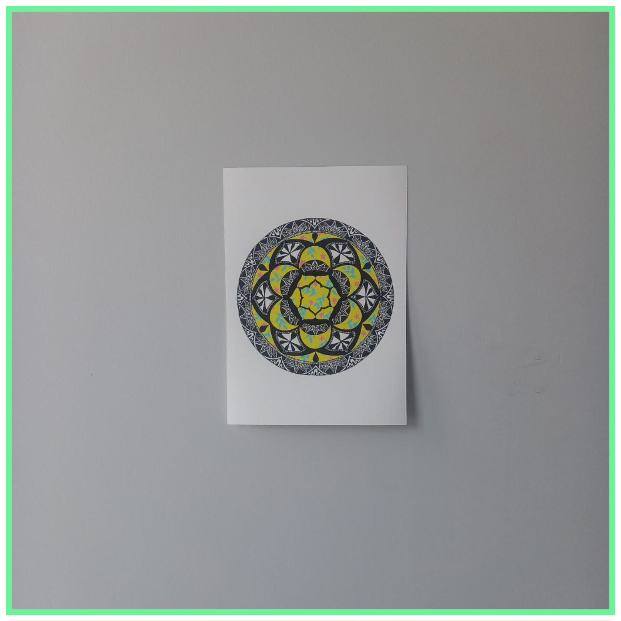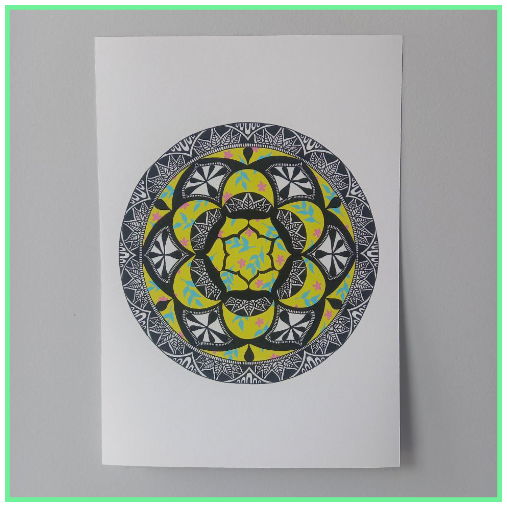 It’s a colourful mandala that blends the calmness of a mandala with the elegance of a floral pattern. It’s joyful yet it invites mindfulness and a moment of pause. I designed it, scanned it and then printed it. I hope this mandala brightens your space. Ideal for a gift.